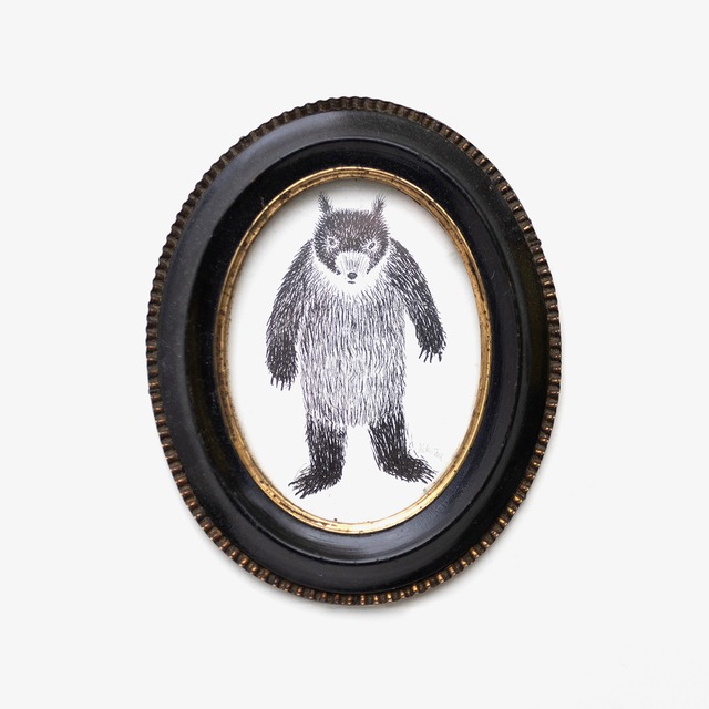 タイトル:楕円のクマ 画材:ペン フレームのサイズ:H13cm×W10cm ※昭和のビンテージフレームを再利用しています。補修済みですが、経年によるハゲやワレ、シミなどがみられます。ご注意ください。 ミヤハラヨウコHP:http://www.yooko.jp