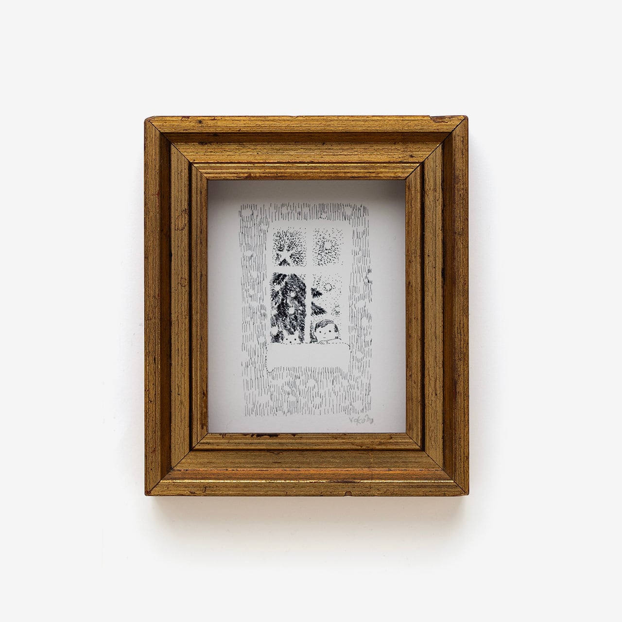 ミヤハラヨウコ 冬の窓(ペン画による1点もののオリジナルの原画)+ アンティークのフレーム