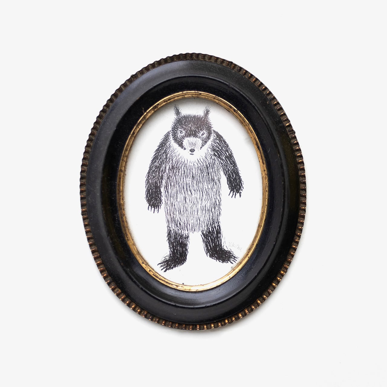 ミヤハラヨウコ クマのかまえ (ペン画による1点もの)オリジナルの原画)+ ビンテージフレーム
